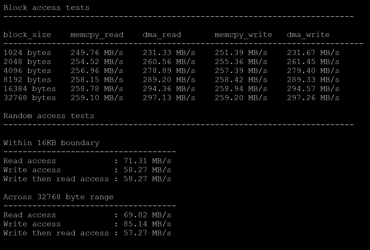 For the block transaction test, the code would read/write block sizes from 1KB to 32KB using both DMA and memcpy. The intent of this test case was to show the limiting behavior of the CPU interacting with the CACHE64 (best case scenario).