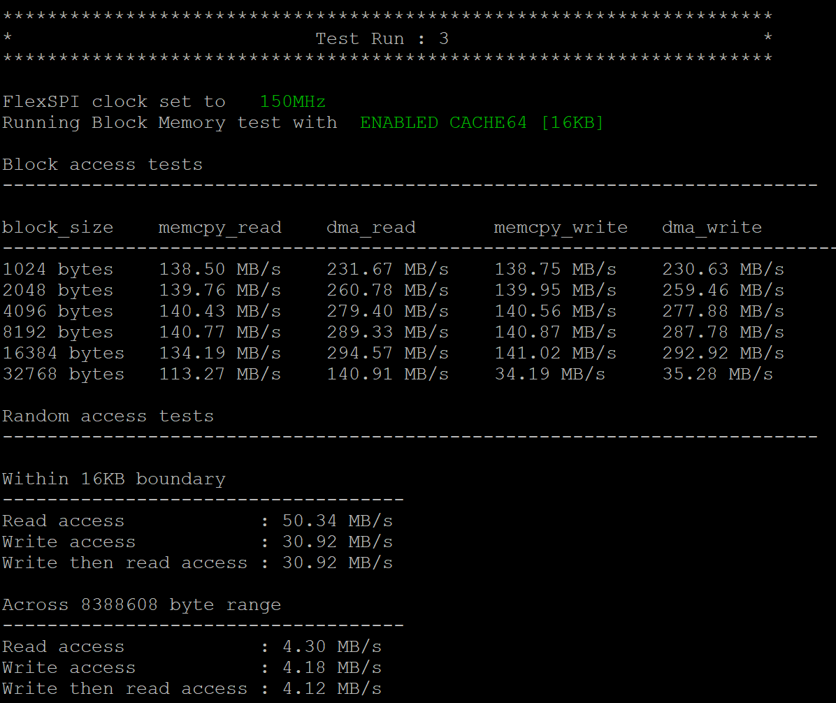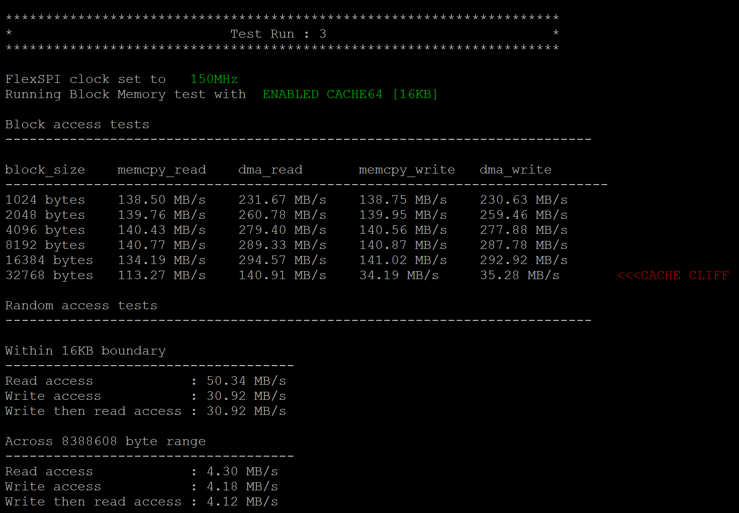 Once the block size is larger than 16Kb, we can see the read and write rates fall significantly. This is to be expected as this is the size of the CACHE64. When the block access is larger than 16Kb, the FlexSPI peripheral needs to perform external access to fetch 512-byte pages (cache miss).