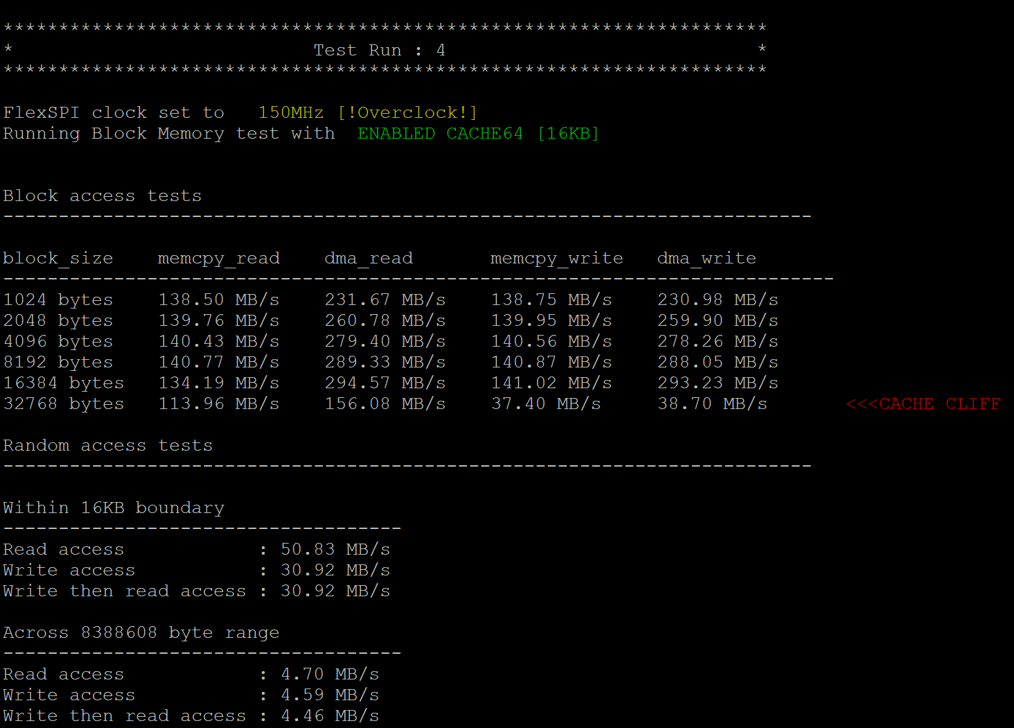 Test run #4 : 150MHz (overclocked) FlexSPI Octal PSRAM – cache enabled