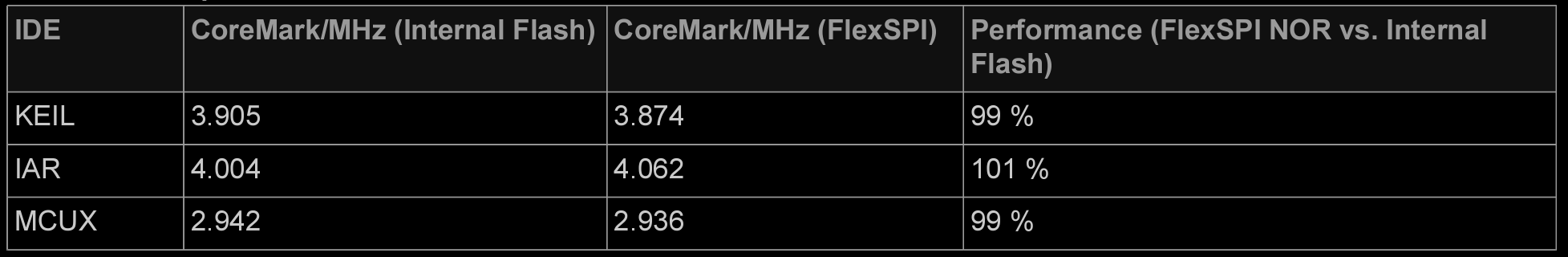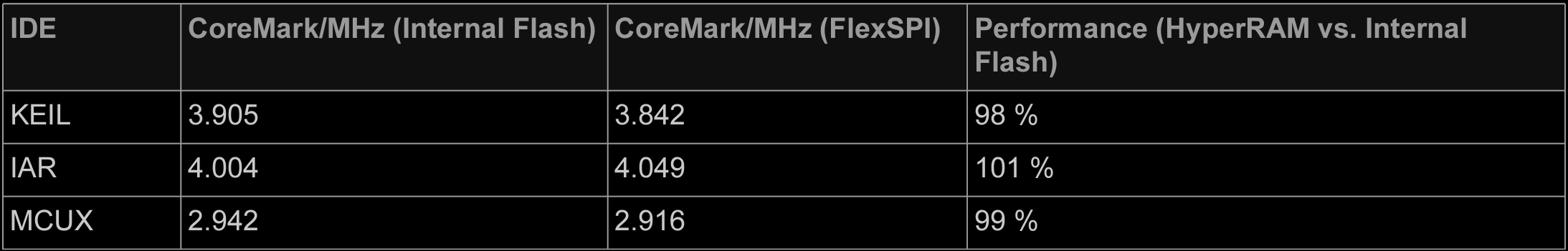 Interestingly, code execution performance is nearly identical when comparing CoreMark scores when running from Internal Flash, Octal SPI Flash and Octal SPI HyperRAM/PSRAM on the LPC5536