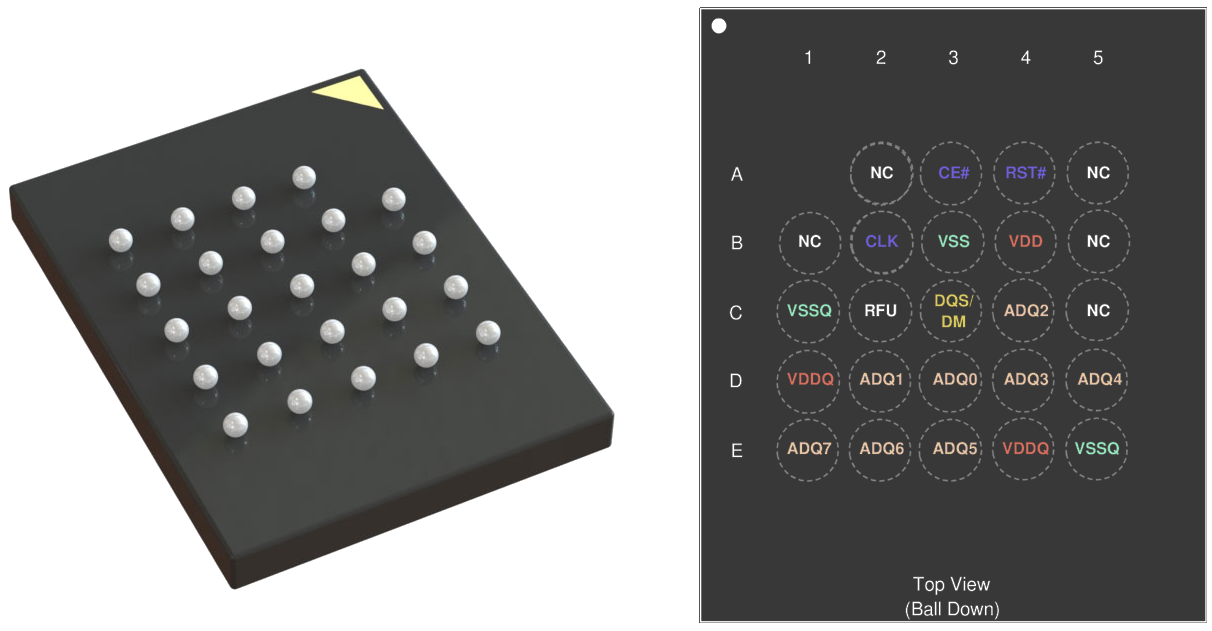 The APS6408L-3OBM-BA is packaged in a small 6mmx8mm, 24-ball, 1mm pitch BGA. This footprint is commonly used for Octal SPI memories and there are several vendors who produce pin compatible devices.
