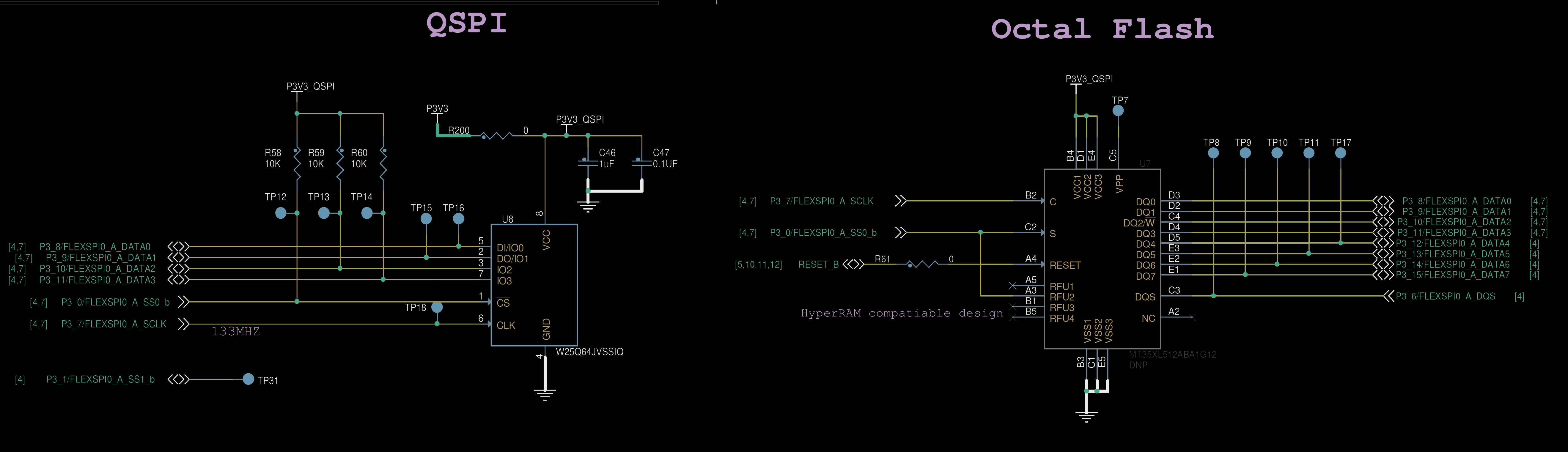 The APS6408L-3OBM-BA is specified for 3.3v operation and a maximum 133MHz clock. PLL1 was used to generate the 133MHz clock for the FlexSPI controller.