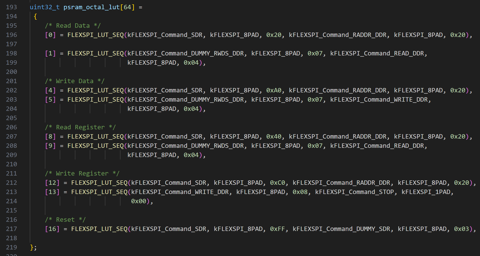 PSRAM devices typically require additional configuration for parameters such as read latencies and burst sizes. This sample provides some defaults that will work with the APS6408L-3OBM-BA. Control register access is performed with the FlexSPI SDK API and the custom LUT.