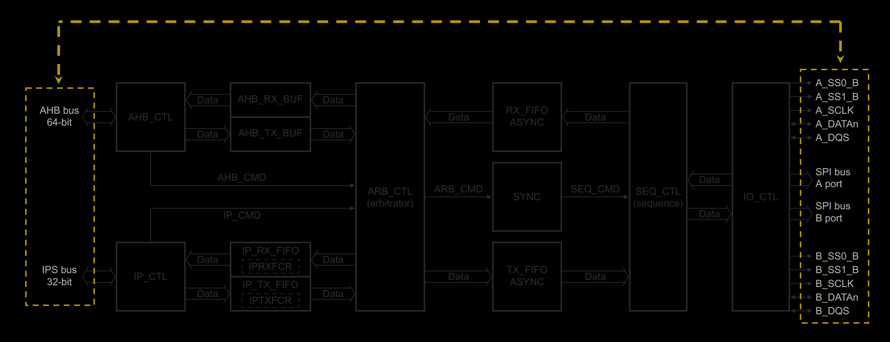 A key point about FlexSPI is that enables the SPI connected memories to appear in the system memory map. The details of the SPI transactions are managed by the FlexSPI controller. This feature enables Execute-in-Place (XIP) capability, where the CPU is executing directly from the external memory.