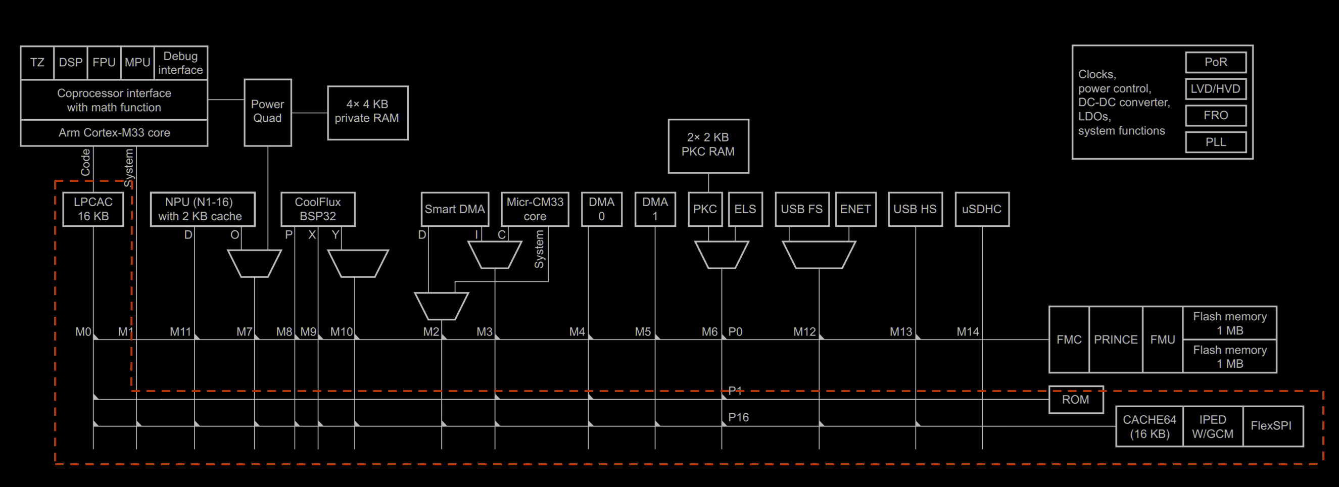 The FlexSPI controller has two ports which can be further subdivided into two separate interfaces allowing a maximum of 4 devices if required. SPI based memories typically are accessed in a burst mode, where a controller will read/write data in 512 bytes blocks. The block access nature of these memories can present challenge for typical MCU uses cases. The MCX N integrates a 64-bit data path, 16KB cache in front of the FlexSPI controller known as CACHE64.