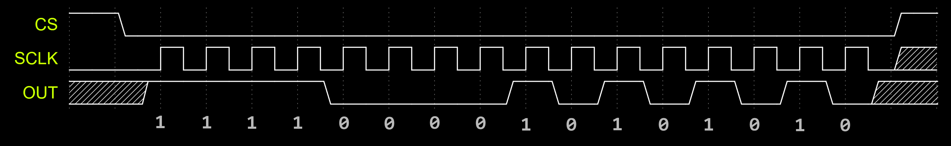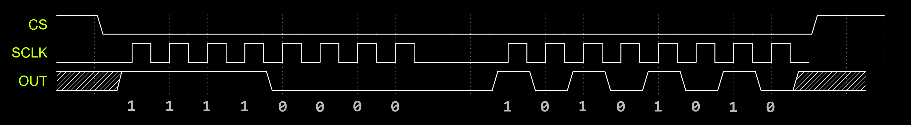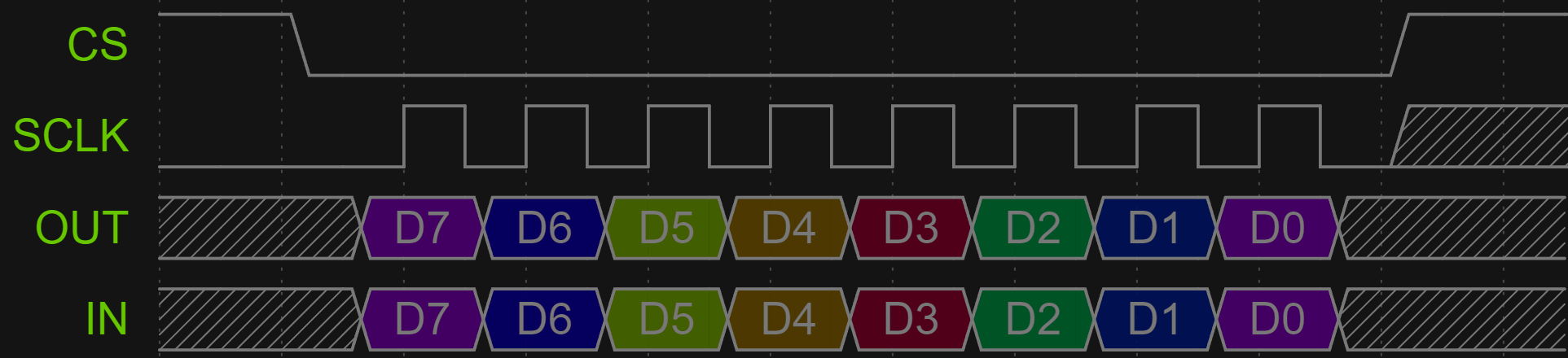 Once you understand that SPI is implemented with a shift register with control logic, you can envision using it for applications outside of the typical use cases. Consider the scenario where the bytes 0xFF and 0xAA are transmitted with a chip select.