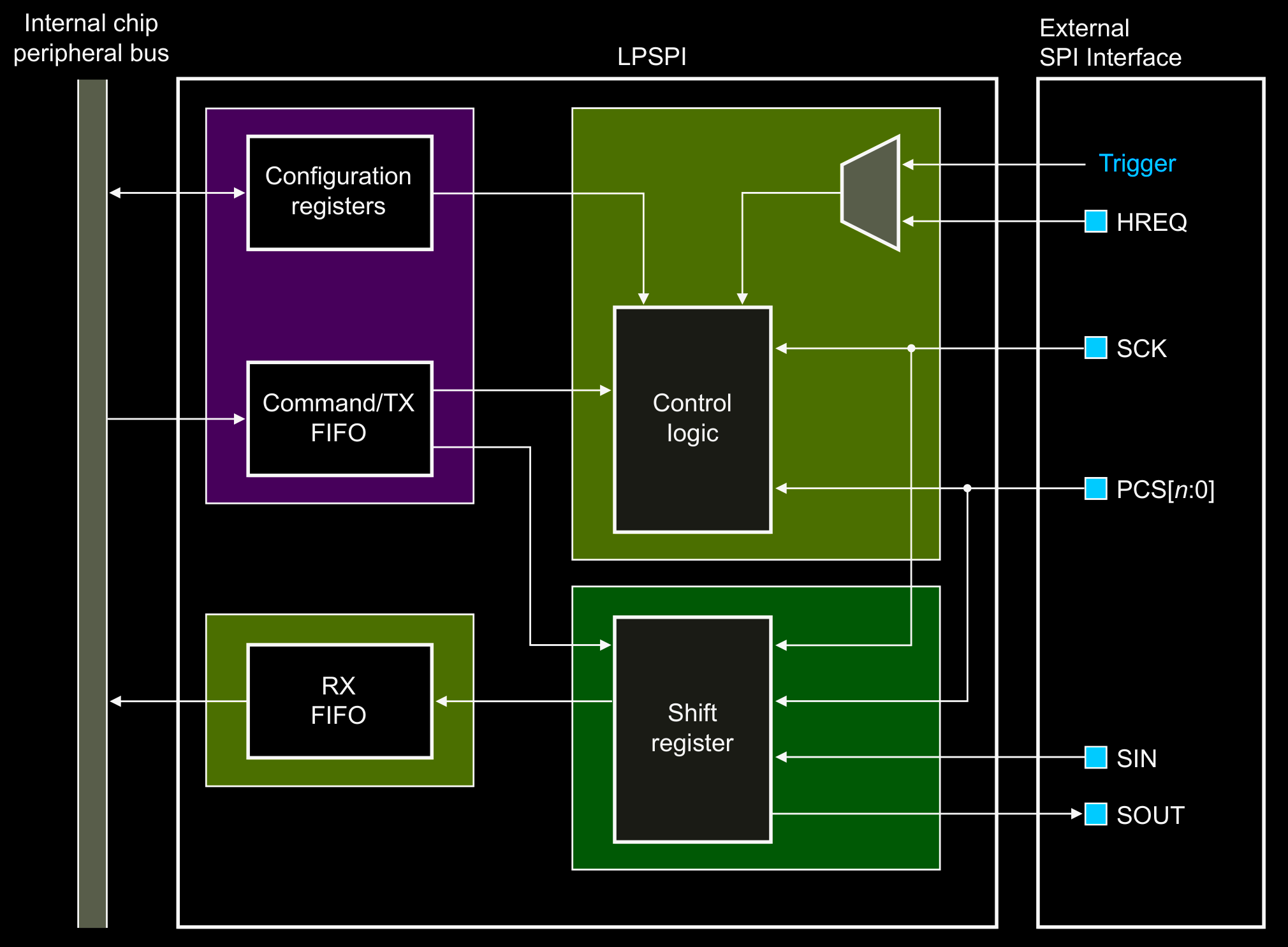 Most peripherals expect some sort of multi-byte transaction where data from the controller has an address and/or command structure. At the core of typical SPI controller is a shift register. The shift register is often surrounded by logic to control clock phase, the chip select signaling and input data loading.