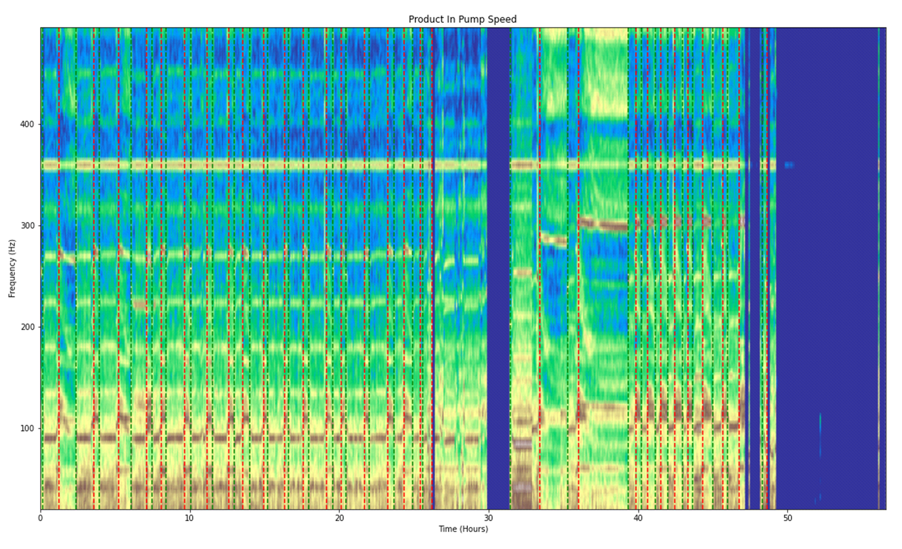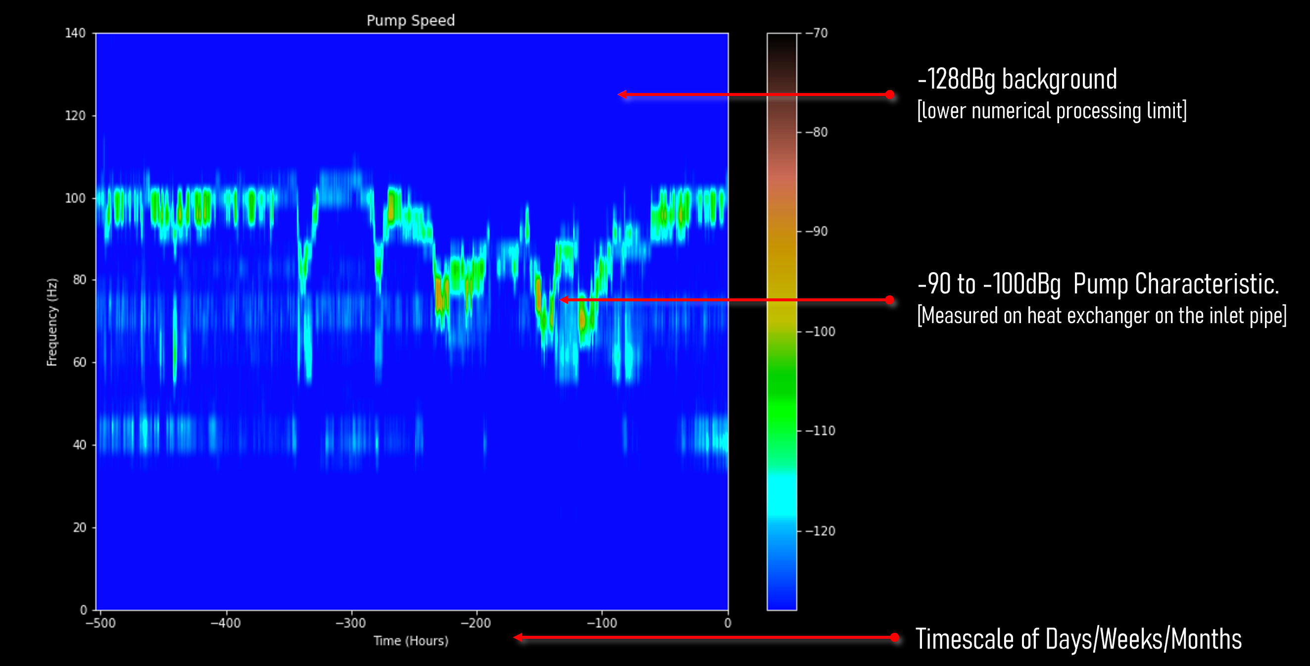 Zooming in, one call pull out interesting characteristics of the machine and other equipment downstream. In this case, the MachineMailbox sensor was mounted on an inlet pipe of a large plate heat exchanger. We could pull out a variable speed pump characteristic of pump that was hooked up downstream from the heat exchanger.