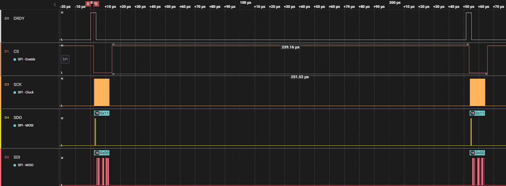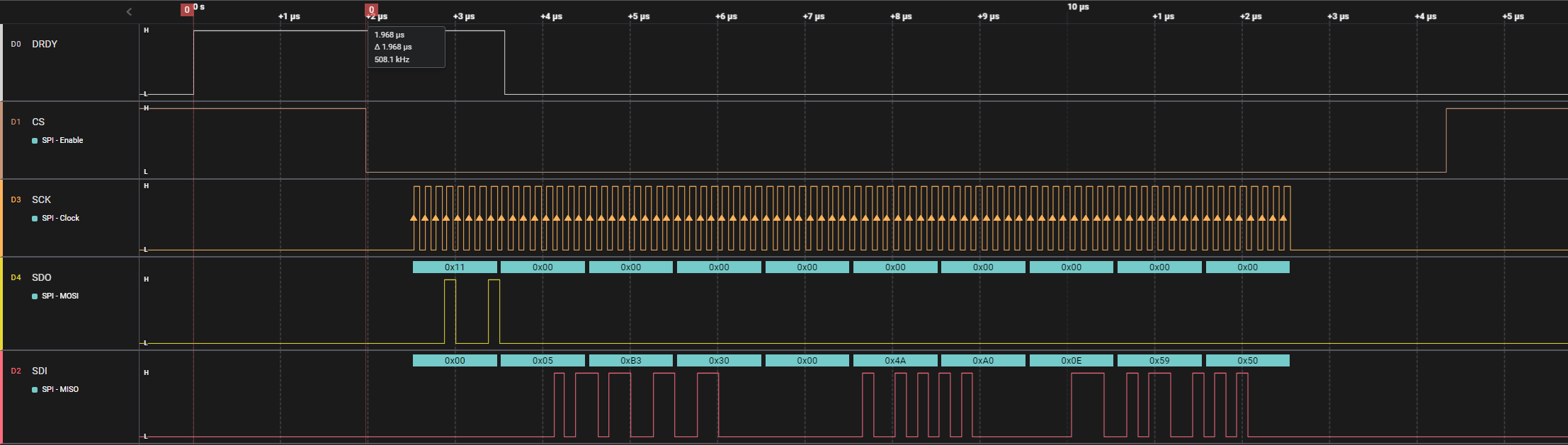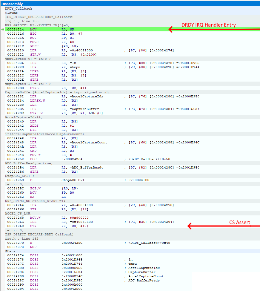 With the 1st implementation, I measured an approximate 2uS latency between assertion of DRDY and the assertion of CS. The IRQ handler had to perform some housekeeping and buffer management. When I consider the 64-MHz nRF9160 clock rate, flash execution access time, and the assembly code generated by the compilers (from the direct IRQ wrapper and my C code), this latency could all be accounted for. With time critical IRQ code, it is a good idea to inspect any code the compiler generates. I like to peek at what the compiler generates to see that everything is in order.